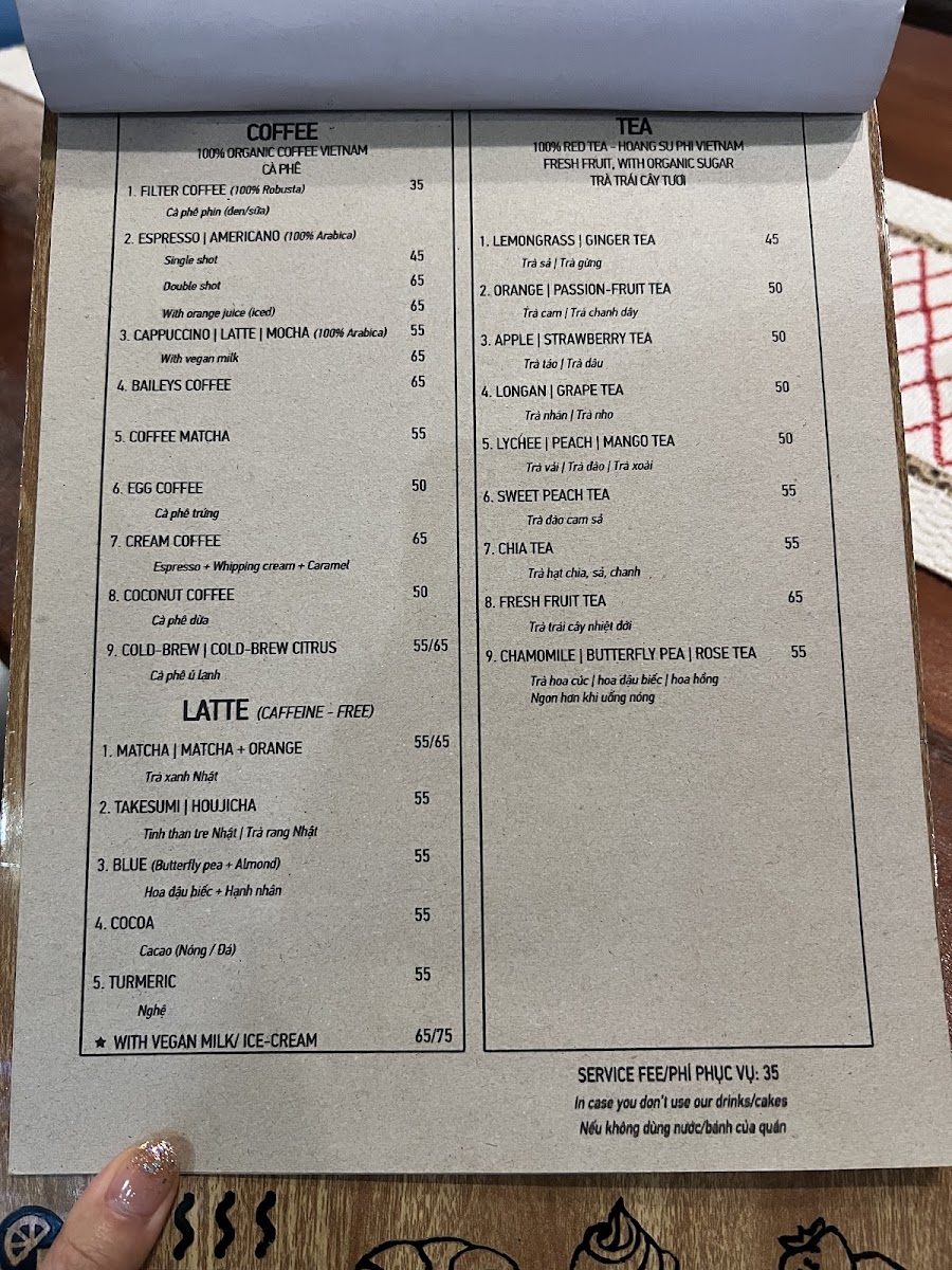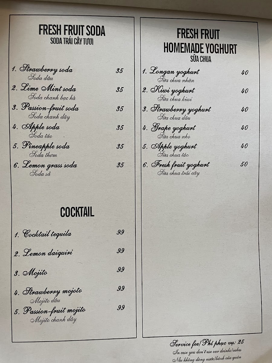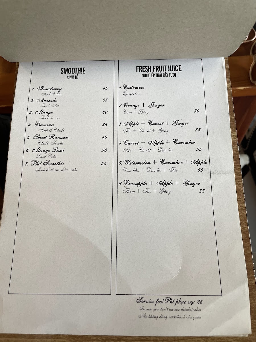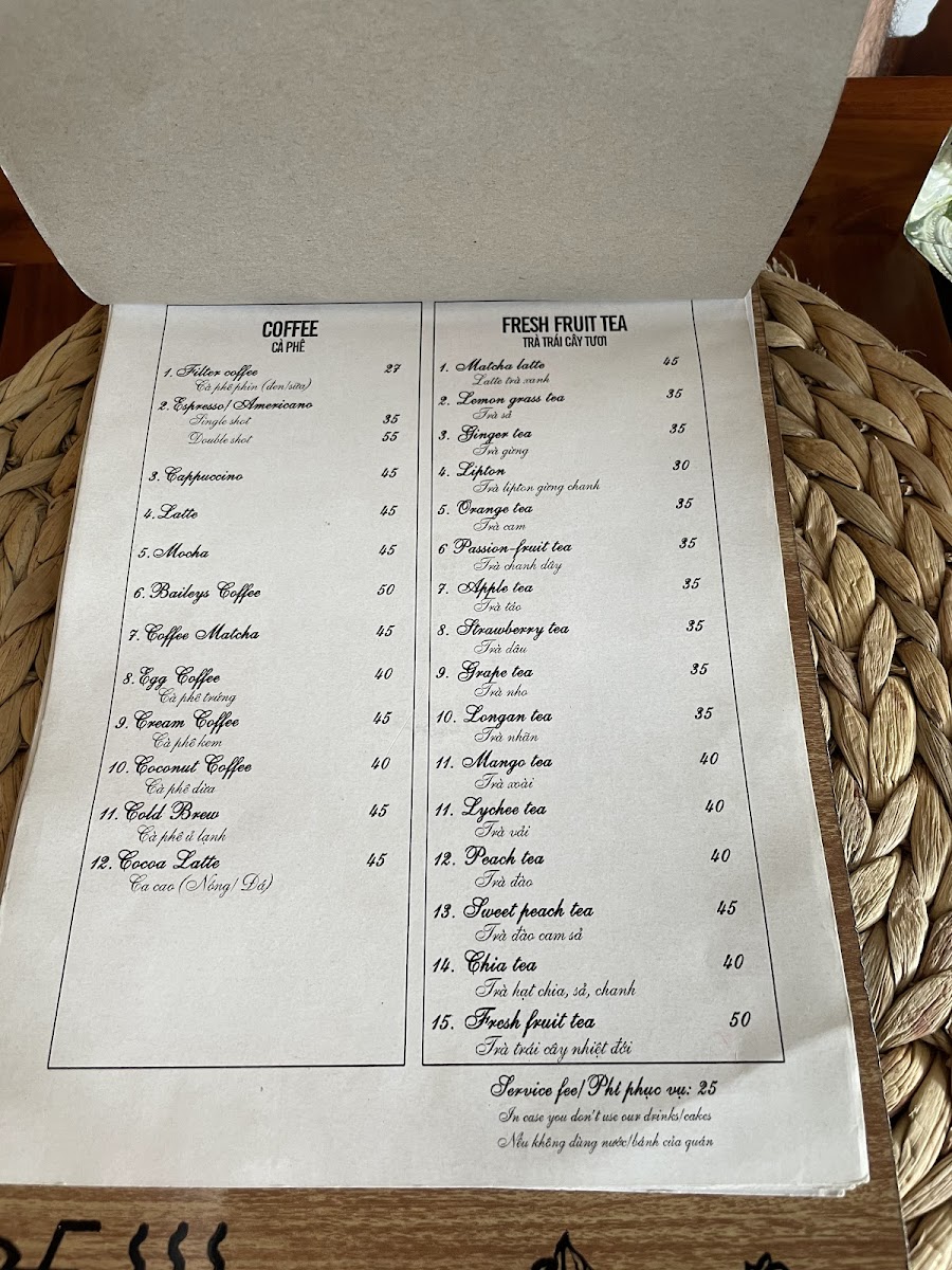 The menu offers a variety of beverages and light food options suited for coffee breaks, casual visits, and light meals. Visitors can expect a selection of coffee-based drinks, including traditional and specialty options such as egg coffee and matcha latte. A range of fresh juices, smoothies, and fruit-based drinks is also available.
