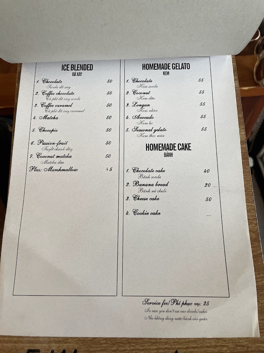Additionally, the menu includes desserts and light snacks, featuring items like coconut ice cream, fruit yogurt, banana bread, and cheesecake. These options provide suitable accompaniments for those looking to enjoy a light refreshment alongside their drink.